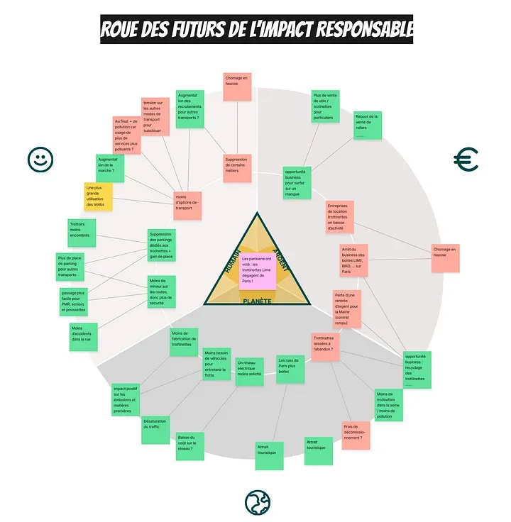 Ici, je vous propose une version retravaillée de la Roue des futurs, mixée avec notre triangle de l’Impact Responsable.