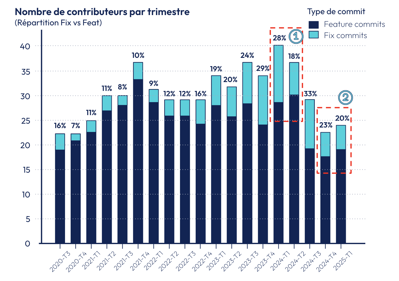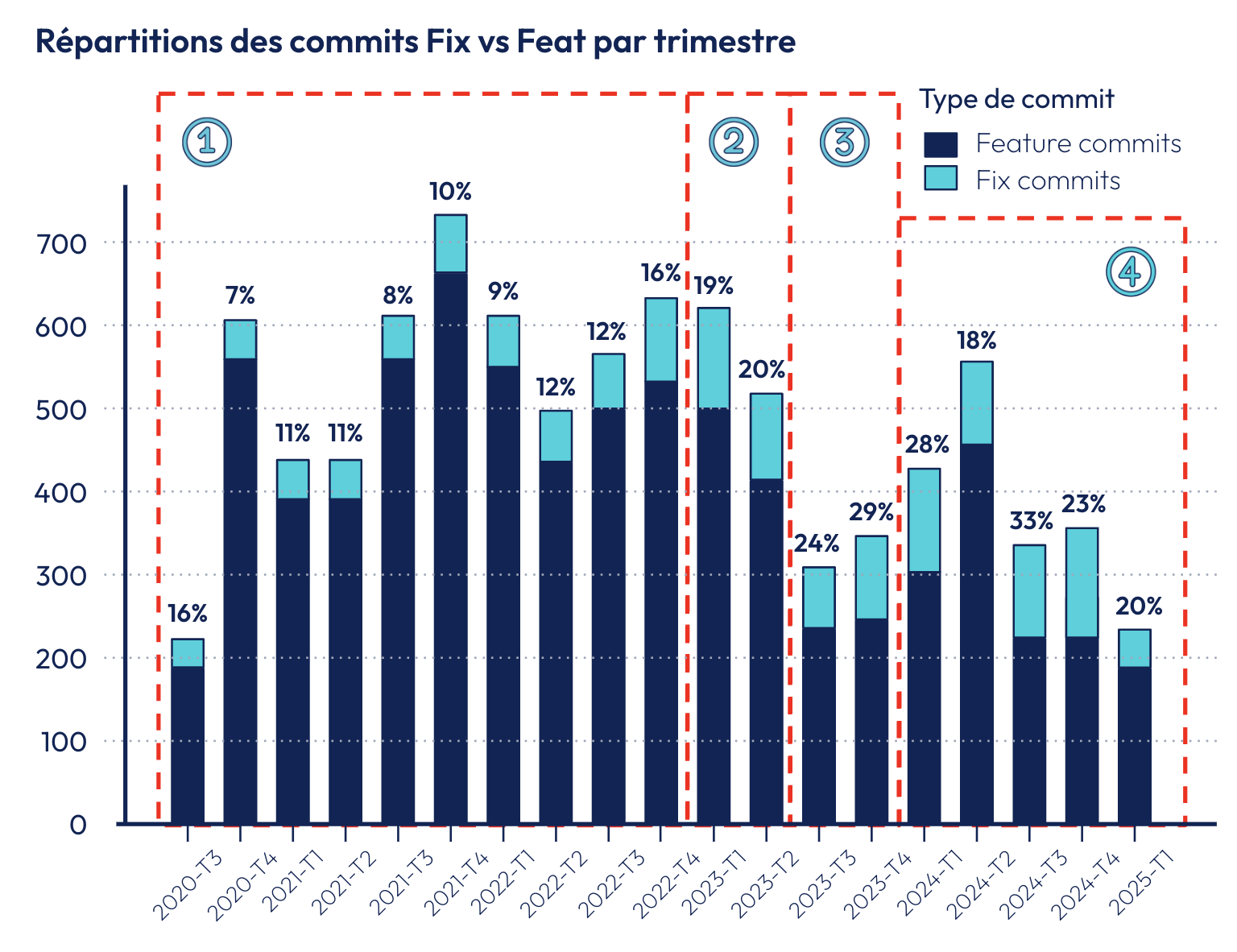 Malgré ces défis, l’apport de valeur est resté relativement stable, autour de 90%, avec 10% de corrections de bugs. Il est important de noter que ce chiffre reflète les bugs corrigés et non ceux qui ont été identifiés mais non traités immédiatement.