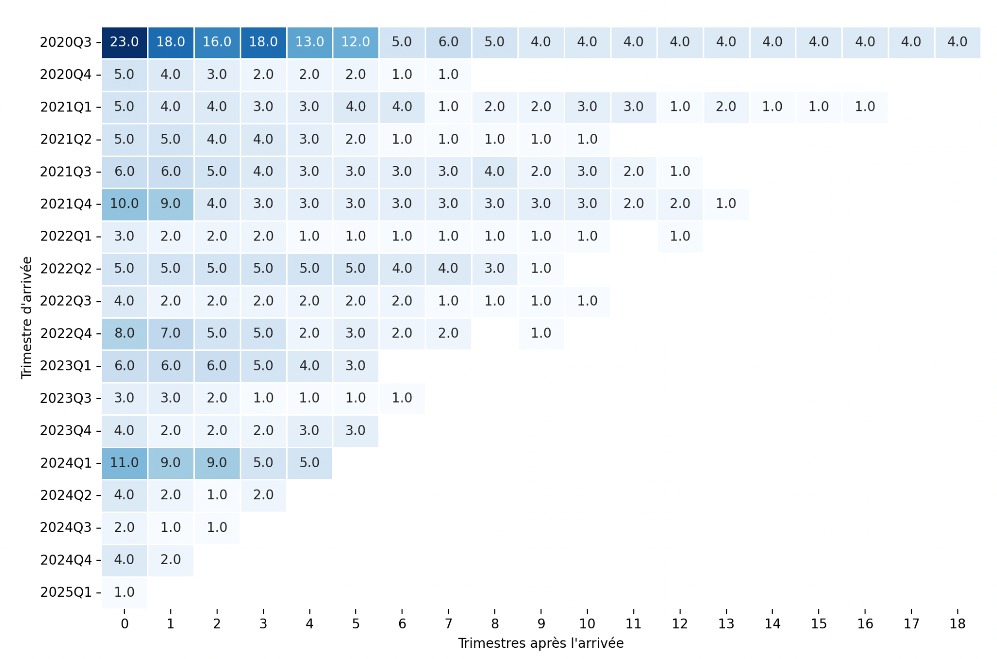 L’analyse des cohortes met en évidence la dynamique des effectifs tout au long du programme. La première colonne illustre le nombre de nouveaux développeurs intégrés au début de chaque période, tandis que les colonnes suivantes indiquent le nombre de développeurs restant sur la période suivante (N+1).