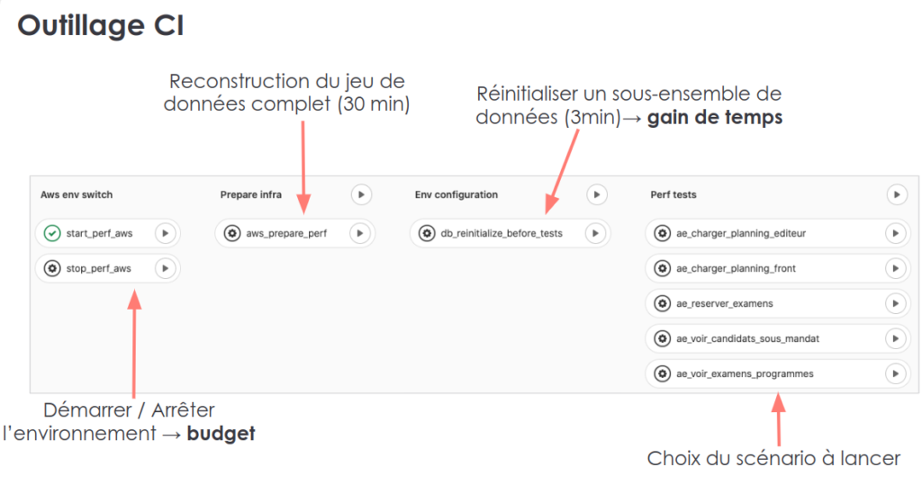 Pour lancer les scénarios et améliorer le feedback, des pipelines gitlab-ci ont été construites. Différents types de jobs ont ainsi été créés, pour :
