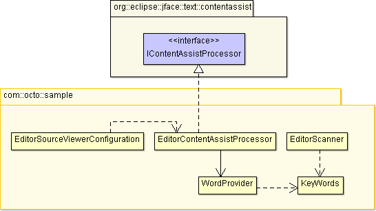 Pour se faciliter la vie on veut mettre de la complétion sur les mots clés. L’opération nécessite l’ajout de deux classes, l’une pour construire la liste des mots à proposer à partir du début d’un mot (WordProvider), l’autre étant l’implémentation de l’interface IContentAssistProcessor qui est l’objet dont la responsabilité est d’extraire le dernier mot saisi (EditorContentAssistProcessor). Il faut aussi "greffer" notre ContentAssistProcessor…