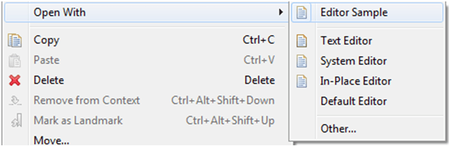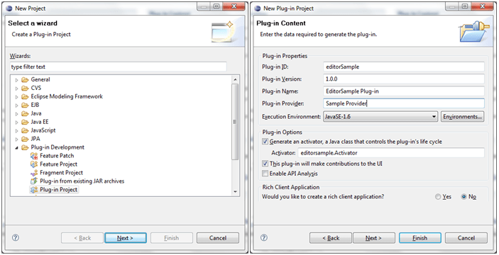Pour lancer un eclipse avec notre plugin, il faut ouvrir le fichier plugin.xml avec le plug-in Manifest Editor (click droit sur le fichier plugin.xml, puis open with plug-in Manifest Editor) et de lancer l’application depuis l’onglet overview. Il faut se construire un projet avec un fichier d'exemple et ouvrir le fichier par le menu contextuel "open with Editor Sample"