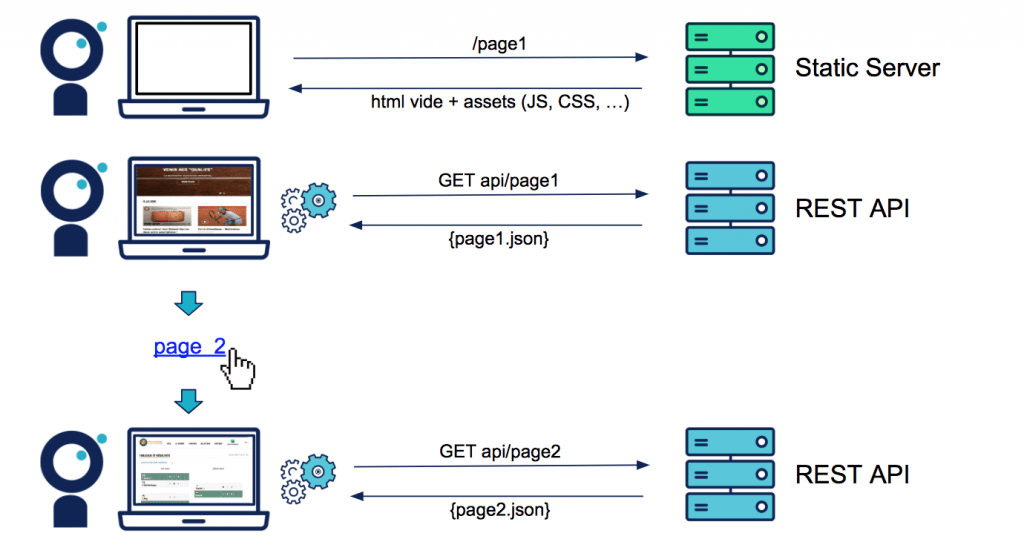 Dans une SPA, l’ensemble des assets du site sont chargés lorsque l’utilisateur arrive sur la première page. Tous les templates du site sont pré-chargés, il suffit de récupérer uniquement la donnée qui va les alimenter pour l’affichage.