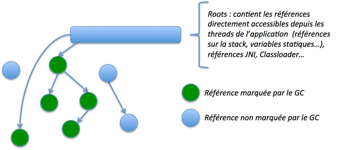 Les threads de l'application pointent vers ces objets survivants au travers des "roots". Les roots sont des structures de données (qui sont dans la stack locale du thread : références à des variables locales, membres statiques d'autres classes...) directement accessible depuis les threads JVM de l'application.