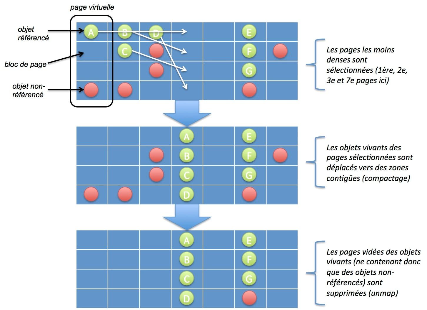 Relocate : lors de cette phase, les objets vivants sont déplacés dans des pages mémoires contiguës afin d'éviter toute fragmentation mémoire :