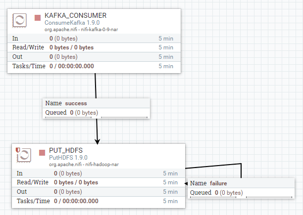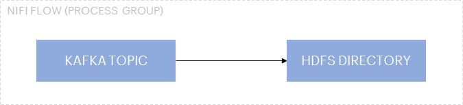 Back to our Kafka to HDFS flow example: ConsumeKafka processor reads messages from a given topic, sends them to PutHDFS processor, which writes them down into a given HDFS folder. In NiFi UI, it could look like below: