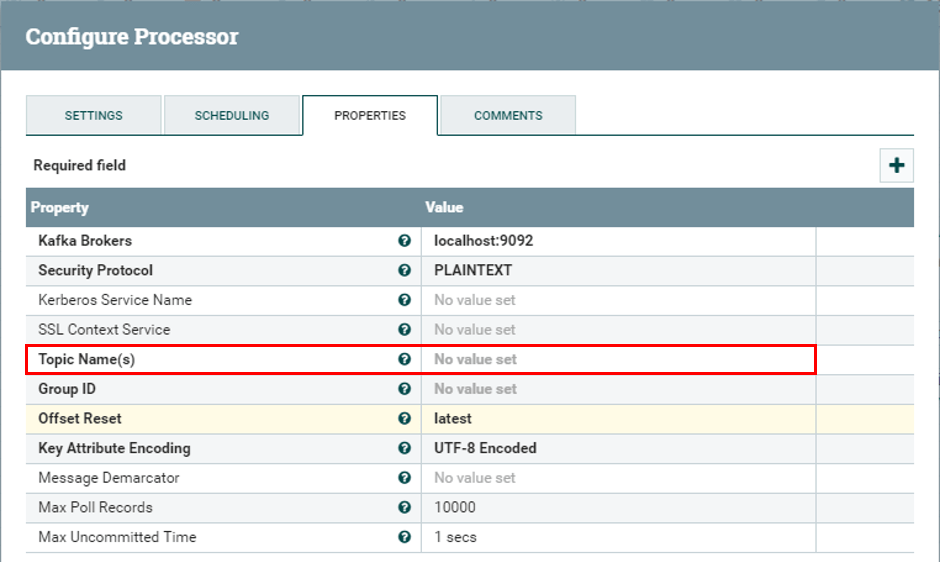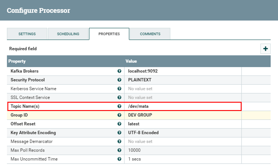 Let’s specialize this NiFi flow by setting the name of the input Kafka topic (framed in red below) in the ConsumeKafka processor. Here are the properties for this processor before updating: