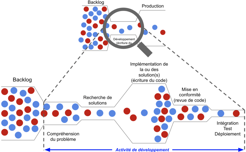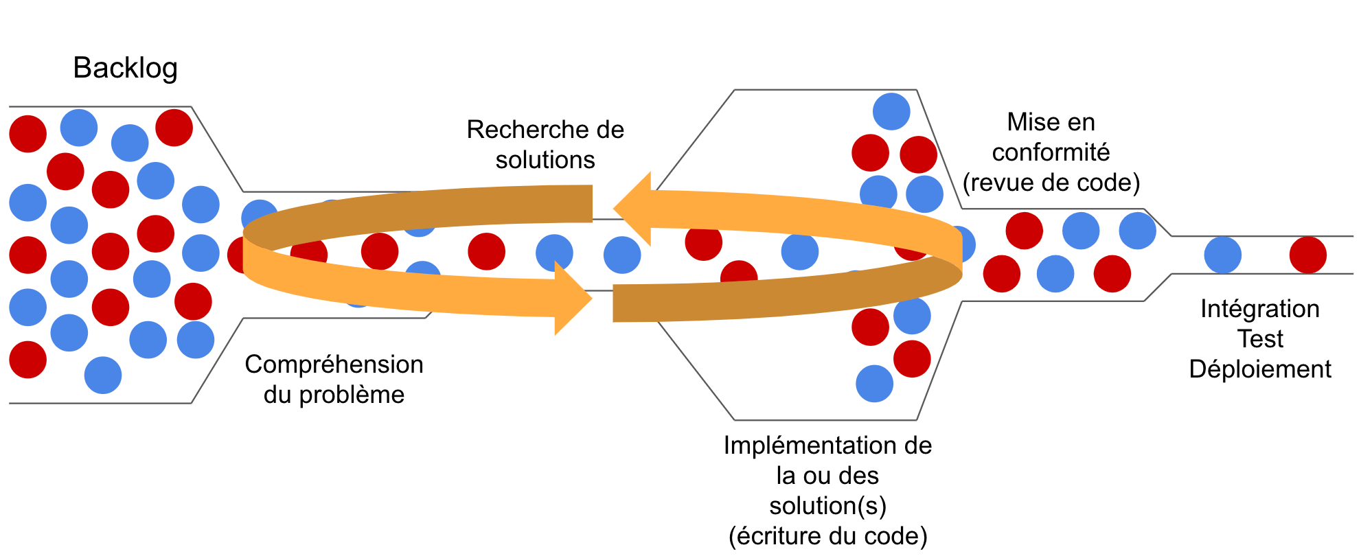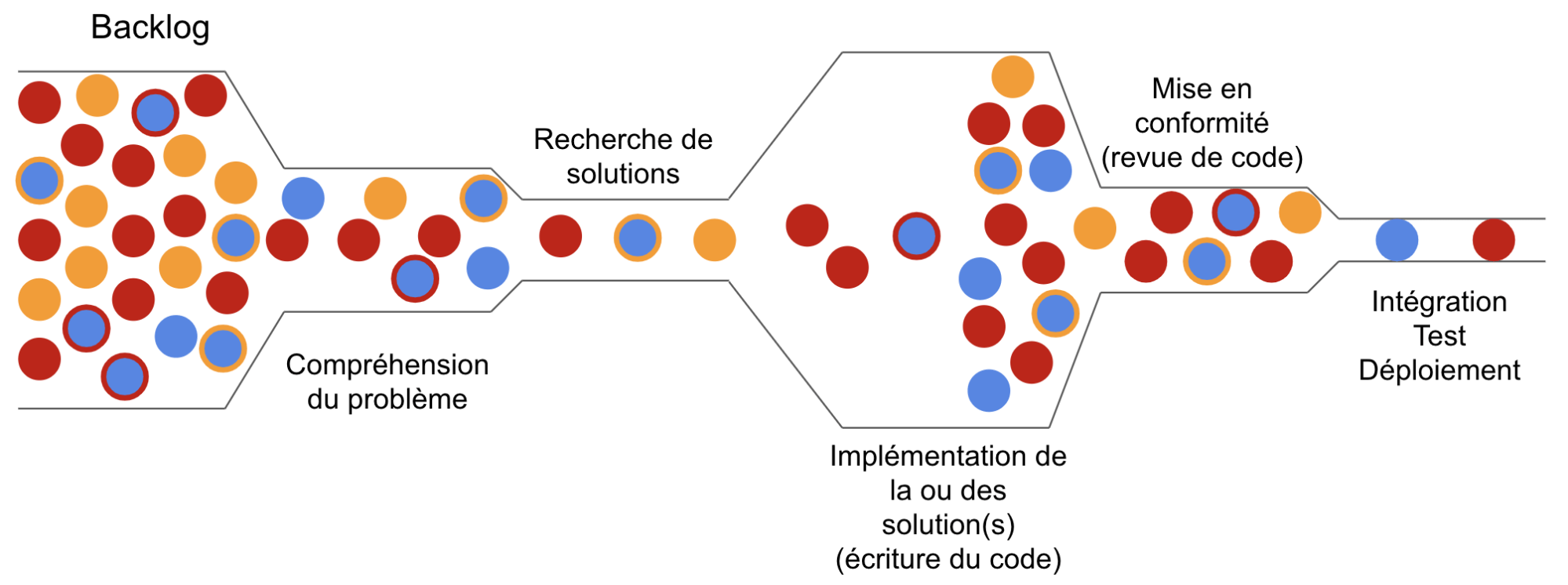Depuis la “vue d'hélicoptère” que peuvent avoir certains managers en lien avec une équipe de développement (n+2, n+3, DSI), il est possible de voir un processus de développement qui semble sous-optimal comme un tuyau encombré :