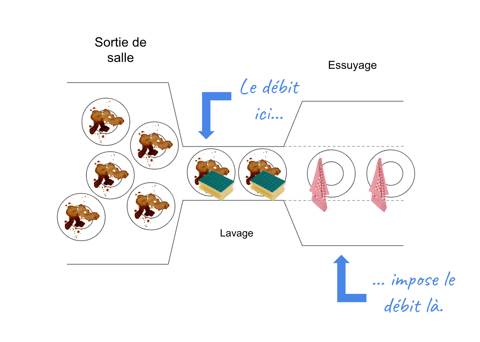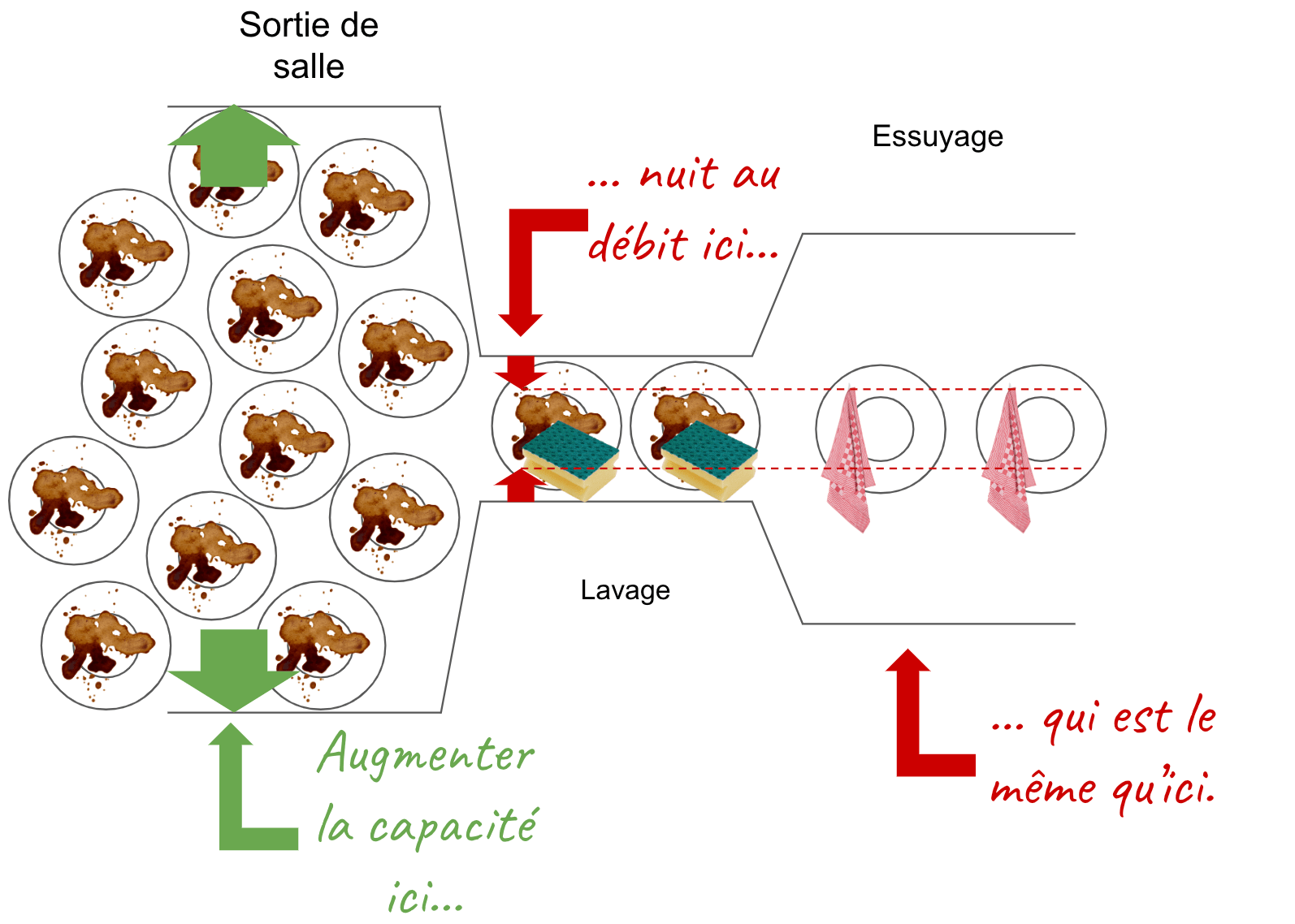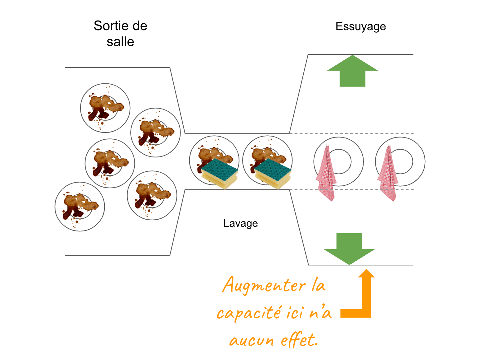 Imaginons que l'activité goulet soit "laver l'assiette sale" : je ne pourrais pas essuyer plus d'assiettes que je ne suis capable d'en laver et ce, même si j'affecte plus d'employés au poste d'essuyage.
