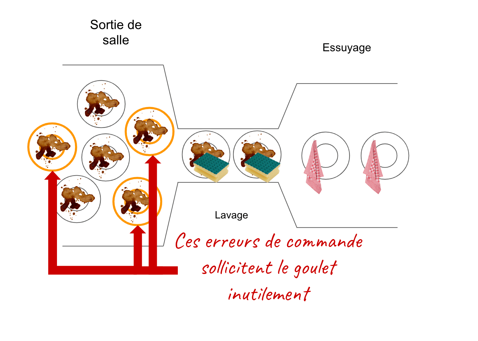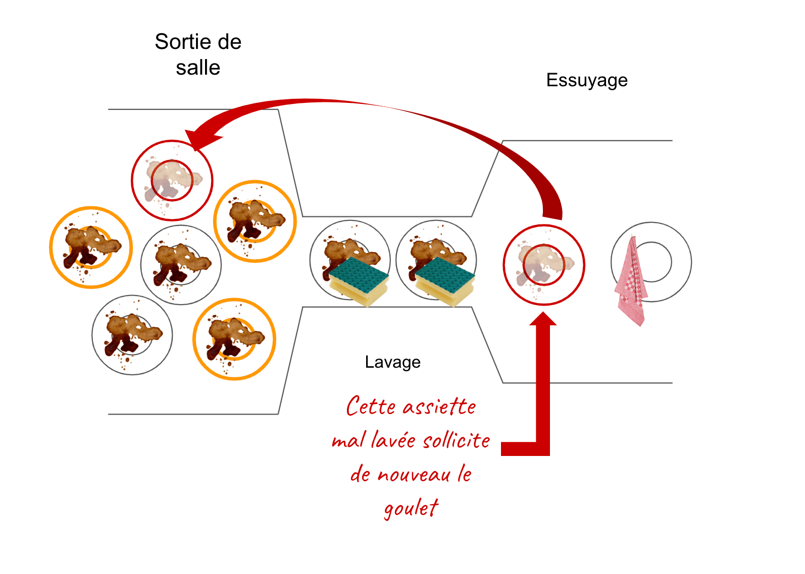 Une façon efficace d’augmenter le débit du système consiste donc à m’assurer que les assiettes sales (input du goulet) soit lavées à bon escient. Autre cas de figure : il est fréquent que les assiettes arrivant au poste d’essuyage aient été mal lavées, on les retourne donc au poste de lavage pour être lavées de nouveau. Pour la même assiette, le poste de lavage, goulet du système, est donc sollicité deux fois, ralentissant d’autant le débit du système.