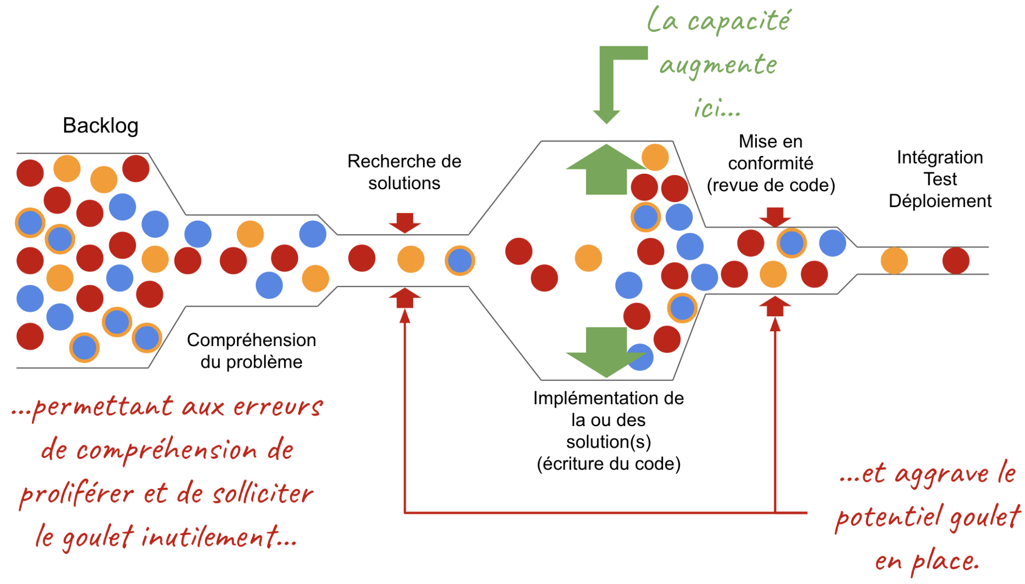 Ces erreurs sont trop souvent détectées en phase d'intégration, de recette ou même en production (c’est à dire une fois que le goulet a déjà été sollicité). Afin de corriger ces erreurs, le goulet devra donc être sollicité de nouveau ce qui aura pour effet de ralentir le débit global du système.
