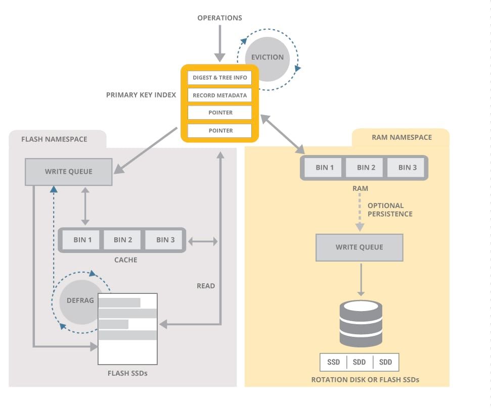 Aerospike est allé plus loin et a fait le choix d’optimiser son produit pour les technologies de stockage Flash. En effet le moteur, écrit en C, court-circuite le système de fichiers et accède directement aux blocs disque.