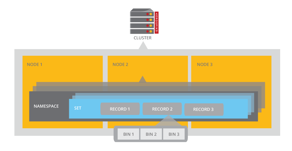 Aerospike est fondamentalement un key-value datastore ; toutefois il propose des concepts de namespace et set – respectivement équivalents aux notions de schema et table dans le monde relationnel – dans lesquels sont organisés les rows accessibles par key. Chaque row dispose quant à elle de bins typés et nommés que l'on peut assimiler à des colonnes.