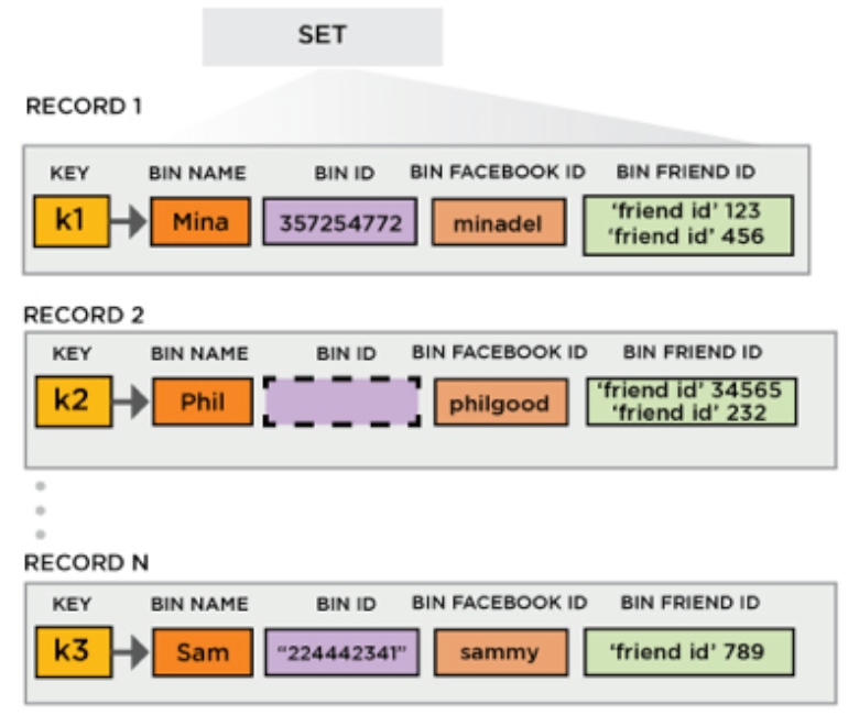 Les bins peuvent être de types primitifs : String, Integer, BLOB ou riches via les Large Data Types : Map, List, Set & Stack.