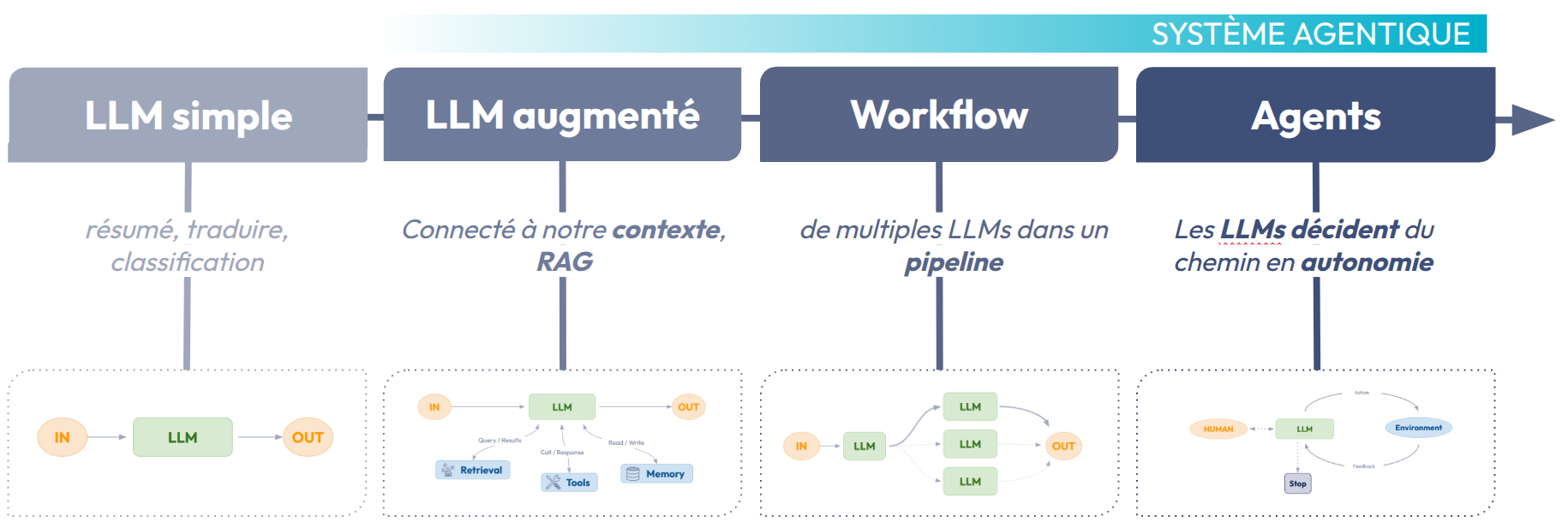 Fig 1 : du LLM aux agents IA