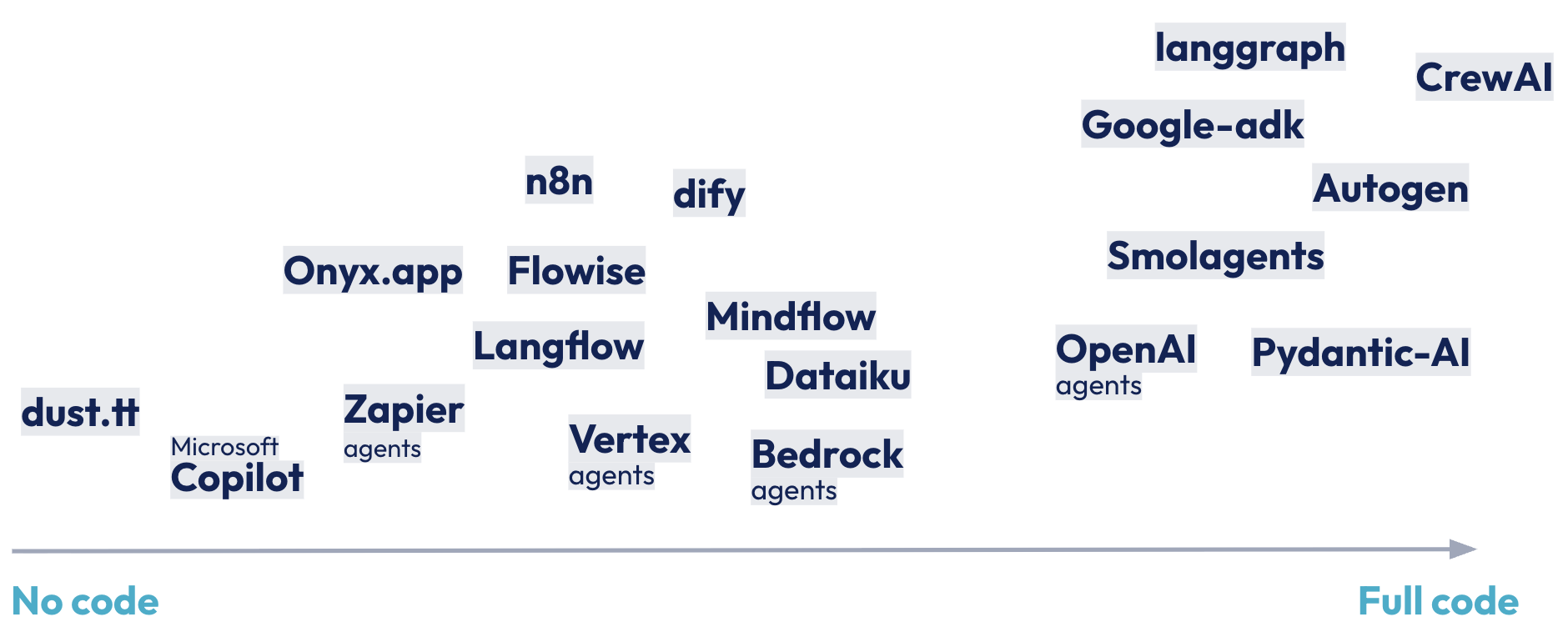 Liste non exhaustive : dust.tt, Microsoft Copilot, Zapier agents, Onyx.app, Flowise, Langflow, Vertex agents, Bedrock agents, n8n, dify, Mindflow, Dataiku, OpenAI agents, Pydantic-AI, Smolagents, Autogen, Google-adk, langgraph, CrewAI