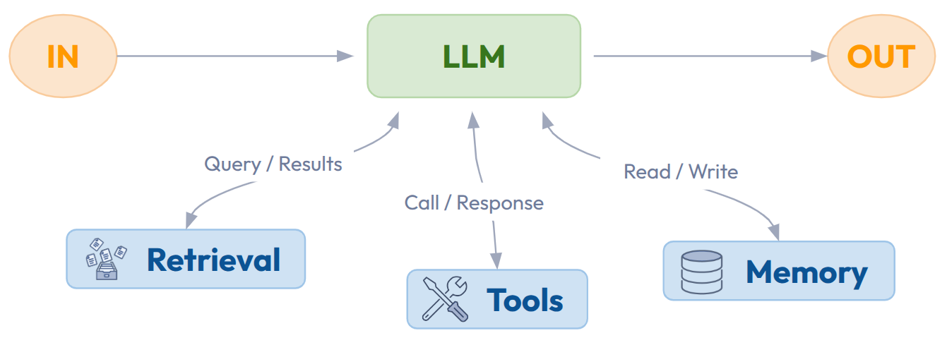 Le lien entre d’un côté le LLM et de l’autre un environnement composé d’outils (API principalement) et bases de données, constitue ce que nous appelons l’augmentation d’un LLM. C’est la brique essentielle dans un système agentique.