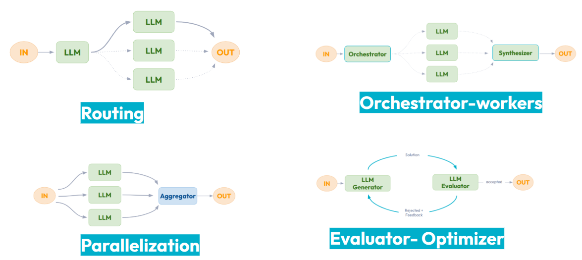 La construction de “workflow” étant assez libre, quelques types d’orchestration adaptés à l'utilisation de LLMs émergent :