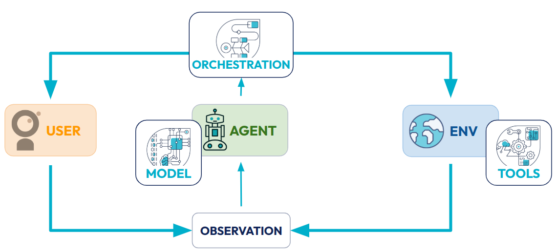 Il existe trois composants principaux d’un agent IA : Le modèle, l’orchestration et les outils (Tools).