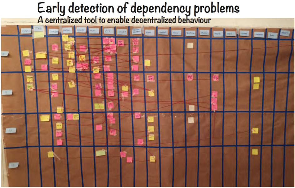 One of very powerful patterns is integration cadence. It is a moment, every week @Spotify or every month @LEGO, when everyone, who works on the same product, gets together. It creates intrinsic motivation to collaborate in preparing demos and space to fail for innovation. It also helps to solve a typical Agile problem of abused autonomy by introducing a hard constraint, where no matter what, the team has to show the results. In addition, it forces them to communicate with dependent teams on potential delays and take decision on planned scope.