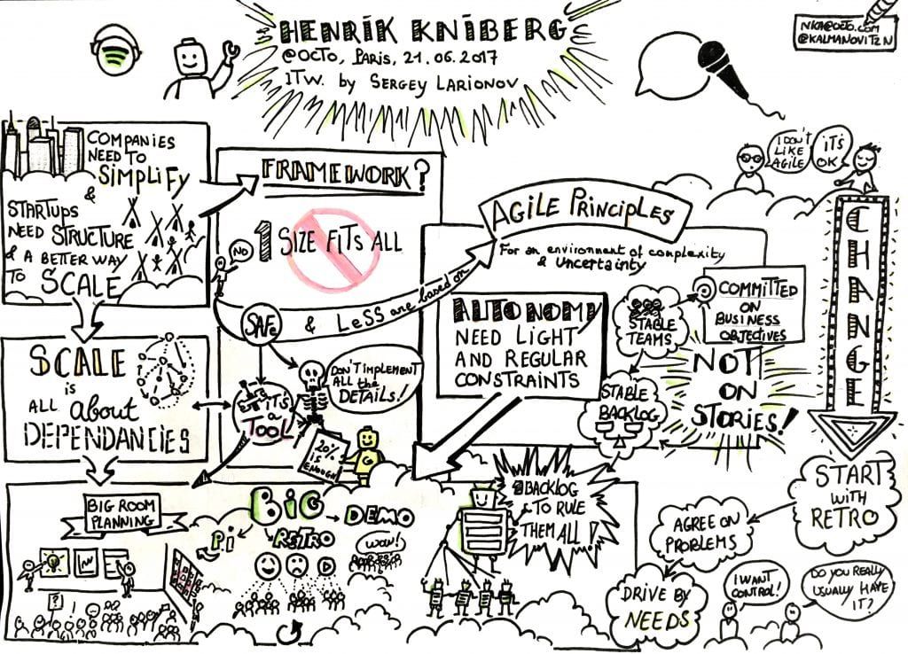 After his presentation at USI, Henrik had accepted our invitation to answer some questions from our clients in their transformation journey towards Agile. This event is facilitated by Sergey Larionov, Agile Coach at OCTO Technology, and made in a breakfast format, where clients can come for 2 hours before starting their day of work. The event was filmed and full video can be found on this link (user/password : hkniberg/the_nextmorningafter_USI).
