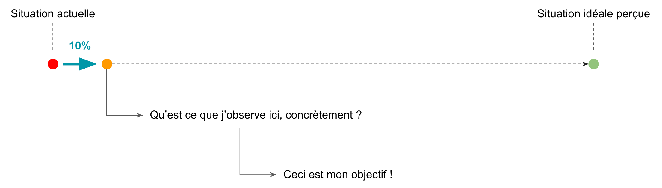 Pour conserver sa motivation il est également nécessaire de ne pas viser trop haut trop vite. Je vous invite donc à reprendre la liste issue du paragraphe précédent. Vos deux ou trois items prioritaires sont-ils facilement actionnables ? En cas de doute, il est intéressant de les décomposer en sous items. Pour ce faire, essayez de visualiser le gap qui existe entre la situation actuelle et la situation qui serait pour vous idéale. Par exemple : imaginons que votre item numéro 1 soit “Améliorer la qualité de code”. Essayez de visualiser la distance entre la qualité du code actuellement produit par l'équipe et celle d’un code qui, pour vous, ne serait pas une contrainte.