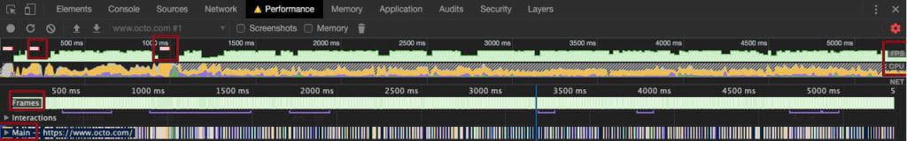 En dessous vous avez la ligne qui correspond à chaque frame produite par le navigateur. En passant votre souris sur chaque frame vous allez pouvoir voir le temps qu’a pris celle-ci pour être produite. On rappelle que l’on s’attend à un temps de 16.7 ms environ pour être proche des 60 FPS. Si vous trouvez des frames plus longues que d’autres sur cette ligne, elles devraient correspondre à des chutes de FPS par rapport à la première ligne.
