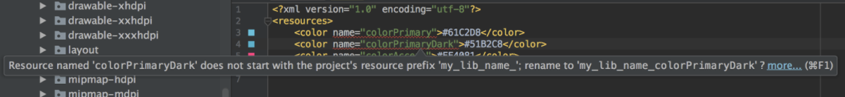 The solution to this problem is to make sure that all the resources you define have a unique name. The recommended way is to use a scheme which will ensure that the resource name will probably be unique. The android gradle plugin provides a convenient way of having this kind of scheme : the resourcePrefix parameter. If you set a string to this parameter you will be “forced” to have all your library’s resource names be prefixed with the parameter you gave. This is a good way to keep in mind to use a unique pattern to avoid name conflicts. Meanwhile, do note that you will still be able to generate your .aar if the resource names do not comply with the prefix you set : this safeguard only warns you in Android Studio if you do not follow the rule you set.