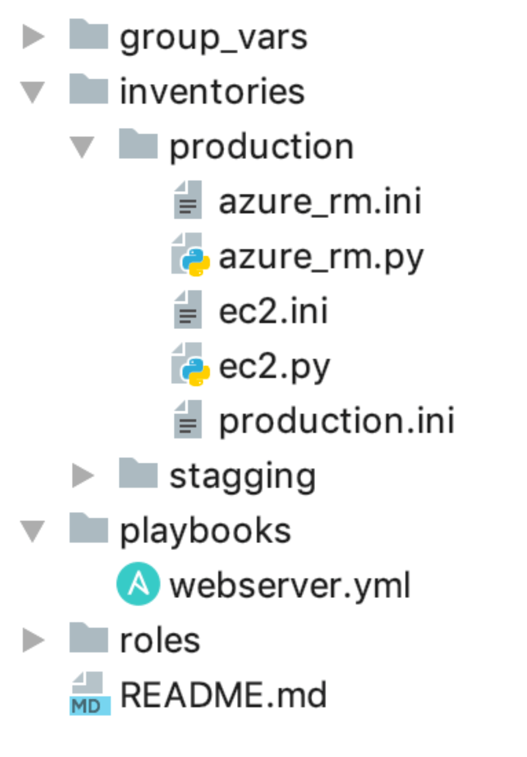 <br><br># inventory/production/production.ini<br>[base:children]<br>webserver<br>appserver<br>bdderver<br><br>[webserver:children]<br>tag_ansible_group_webserver # aws<br>ansible_group_webserver # azure<br><br>[appserver:children]<br>tag_ansible_group_appserver # aws<br>ansible_group_appserver # azure<br><br>[bdderver:children]<br>tag_ansible_group_bddserver # aws<br>ansible_group_bddserver # azure<br>