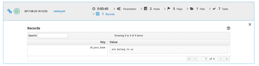 ansible localhost -m ara_record -a "playbook=7ab3858f-5d17-48f1-bb94-19ccdec0c983 key=all_your_base value='are belong to us'"