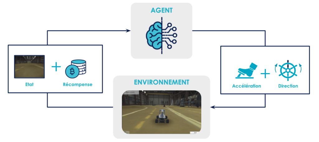 - L’agent est le pilote de la voiture autonome, ou plus exactement l’algorithme de RL utilisé par la voiture pour gérer son pilotage. C’est lui que l’on cherche à entraîner.