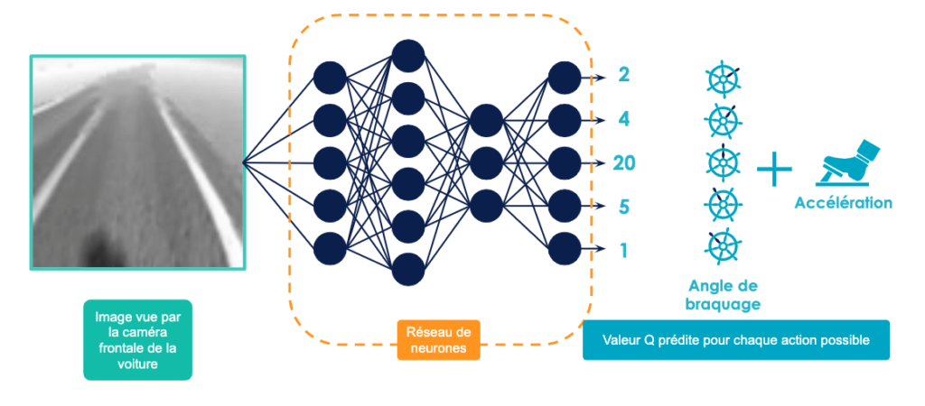 Il s’agit ici de comprendre que l’on veut utiliser un réseau de neurones comme un “oracle” que l’on consulte. On lui présente une image de la route et il nous indique pour chaque action possible la récompense totale que l’on est censé obtenir avant de sortir de la route (i.e. avant la fin de l’épisode) comme le montre la figure 4. Bien entendu cet oracle n’est pas pertinent au début de l’entraînement car on choisit en général des poids aléatoires quand on initialise un réseau de neurones mais on va l’entraîner et ce quasiment de la même façon que l’on mettait à jour notre Q-table.