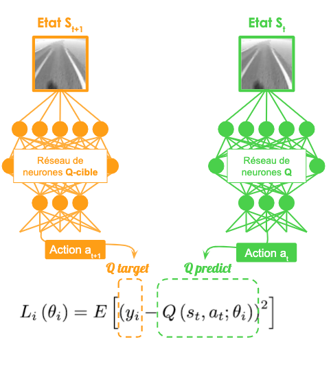 Lors de l’entraînement, les paramètres du réseau de neurones "Q-cible" sont régulièrement mis-à-jour en clonant les paramètres du réseau de neurones "Q" ce qui permet de profiter de l’amélioration de l’estimation dû à l’apprentissage progressif de l’agent pendant l’entraînement.