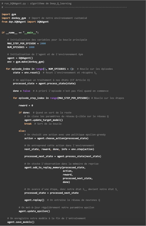 Nous avons décrit l’algorithme de Double Deep Q-Learning utilisé, ainsi que les modalités de son interaction avec le simulateur. Ce qu’il est important de retenir :