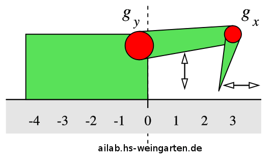 L'espace d'état est constitué de 5x5 positions qu'on modélisera par un tableau. La récompense est la vitesse du robot ; celle-ci peut être positive ou négative. Le robot doit donc apprendre à avancer.