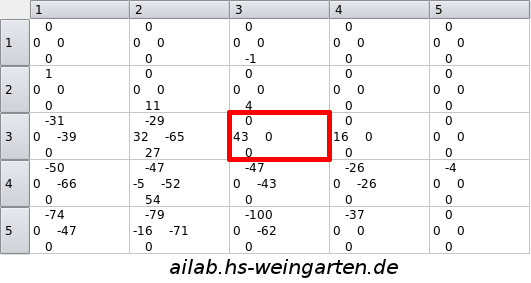 Dans ce cas précis (environnement correspondant au sol sec), lorsque les pièces de l'agent sont toutes deux en position 3, et que la pièce de l’extrémité passe dans l'état 2, le robot avance beaucoup ce qui correspond à une récompense de 43. Ce tableau est formé progressivement à partir de l'observation de la correspondance entre couples états-actions et vitesse du robot.