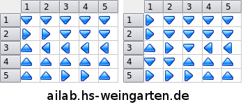 Lorsque l'algorithme value-iteration a terminé de converger, V* est complètement définie et le robot a donc une politique dite optimale. Voici cette politique de transition entre états donnée par le tableau de flèches ci-dessous pour chacun des environnements :