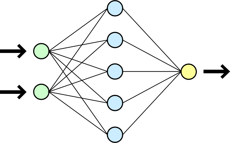 Voici un réseau neuronal modélisé. Chaque neurone pondère les stimulations qu’il reçoit en entrée et stimule à son tour les neurones auxquels il est connecté en sortie :