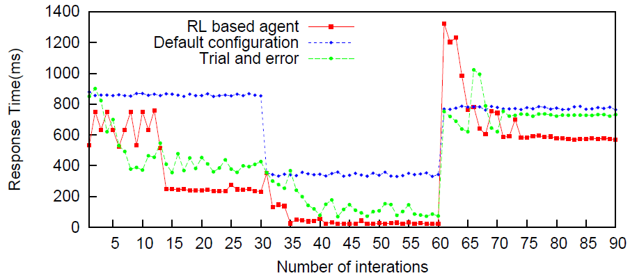 Les résultats obtenus montrent une adaptation rapide à des changements de charge (itérations 30 et 60) par rapport à la vitesse d’un administrateur qui doit manuellement paramétrer le système, et de meilleurs choix par rapport aux configurations par défaut (réalisées à partir d’heuristiques pour chaque typologie d’environnement). Voici une des situations