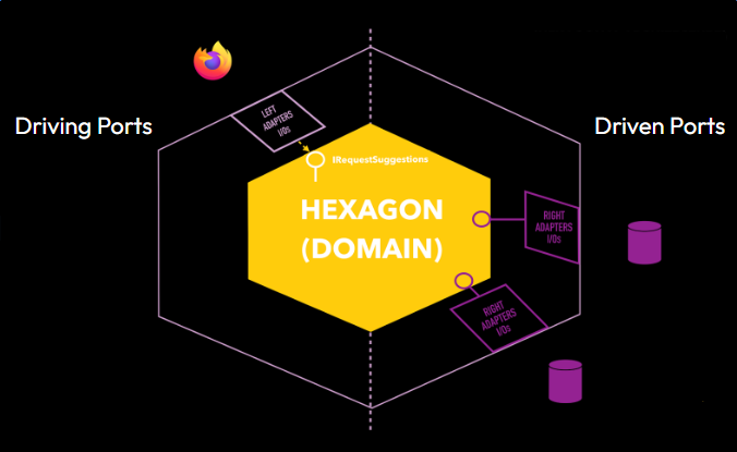 Les données entrantes arrivent par le côté gauche du schéma via les ports entrants (Driving Ports), tandis que les données sortantes apparaissent sur le côté droit via les ports sortants (Driven Ports).