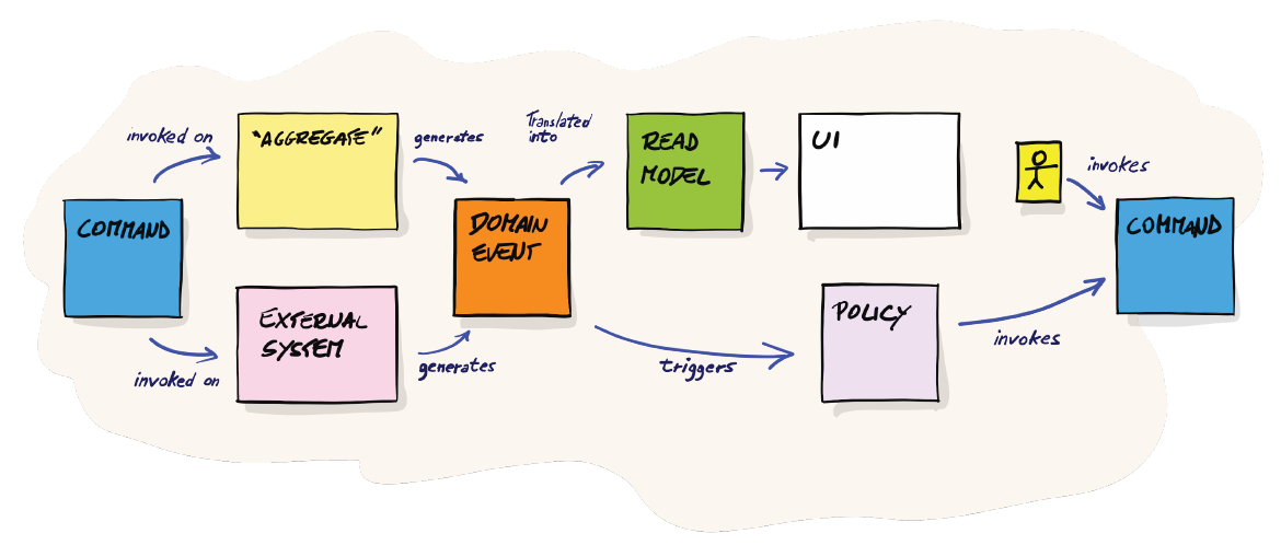 Un événement peut être consommé par deux types d’éléments. Le premier est la Policy (post-violet) qui représente une ou plusieurs règles métier. Une Policy peut être manuelle ou automatique et traduit une décision prise en réaction à un événement. Le second consommateur possible est le Read Model (post-it vert) souvent couplé à l’interface utilisateur (post-it blanc) qui correspond à la partie de lecture et de restitution de l’information. Cette interface peut à son tour permettre à l’utilisateur (petit post-jaune vertical) de déclencher une nouvelle commande.