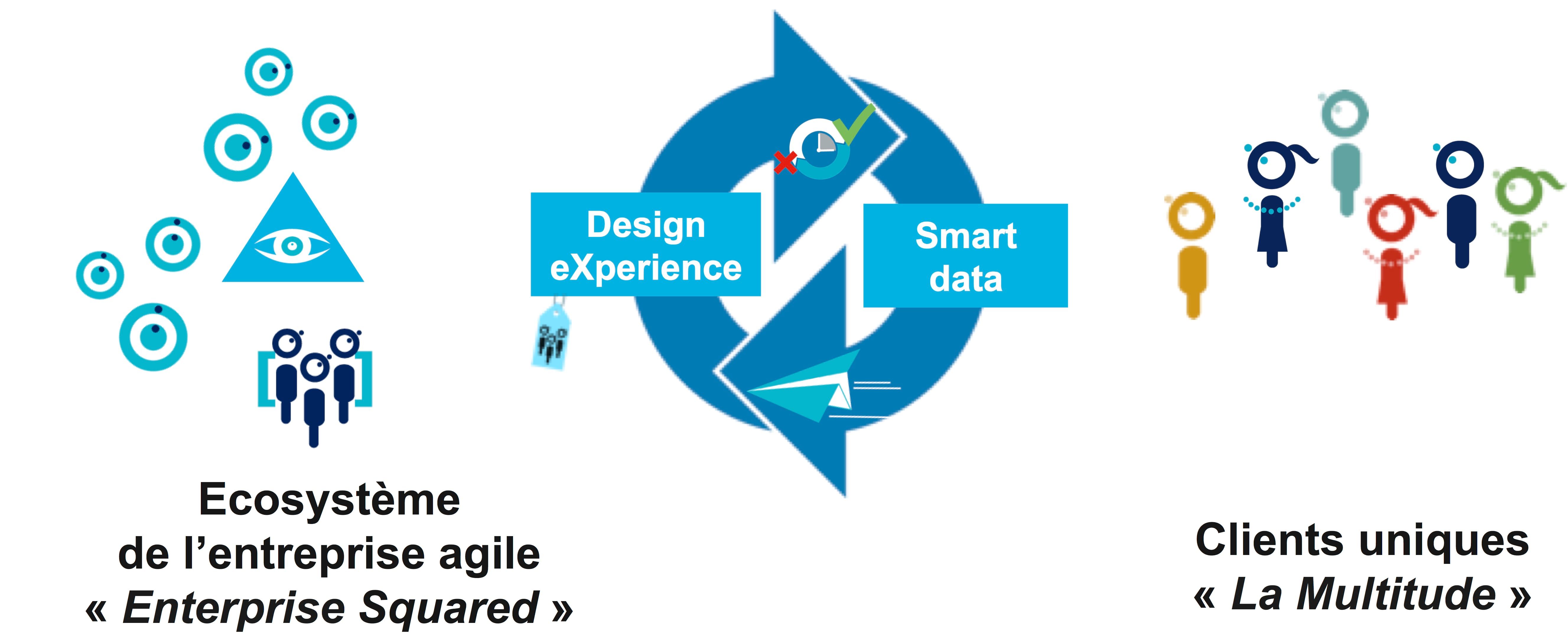 - La culture digitale est partagée, la multidude et l’expérience client sont au cœur du business et des processus (inspirés des pratiques des Géants du Web), et où chaque collaborateur adopte la responsabilisation du Design.