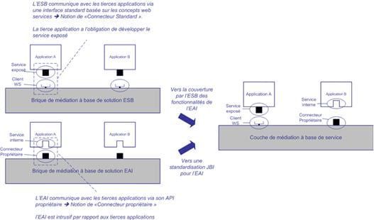 Outil EAI ou outil ESB comme " médiateur ", la question se pose de moins en moins voire plus. La raison c'est que les deux outils convergent techniquement proposant ainsi les mêmes fonctionnalités, et en particulier : l'utilisation de connecteurs propriétaires pour s'interfacer avec les tierces applications et l'exposition et la consommation de web services basés sur les standards du marché, tout en conservant les fonctionnalités classiques d'un outil d'intégration (routage, transformation, filtrage, enrichissement, etc.)