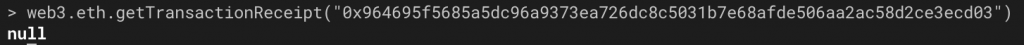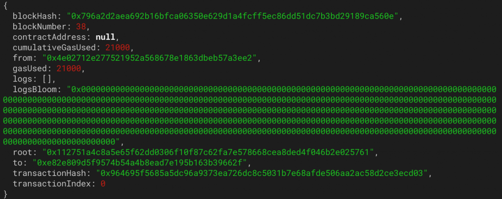 L’envoi nous retourne l’id de transaction ; on vérifie son reçu en tapant : $> web3.eth.getTransactionReceipt("<TRANSACTION_ID>")