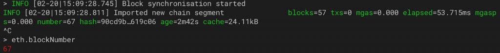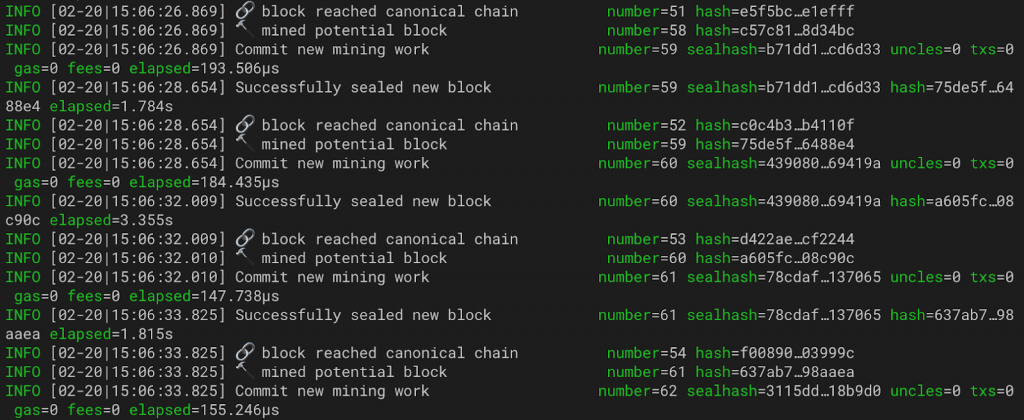 Faisons tout d’abord travailler nos deux mineurs depuis leurs consoles respectives, sur 1 thread : $> miner.start(1)