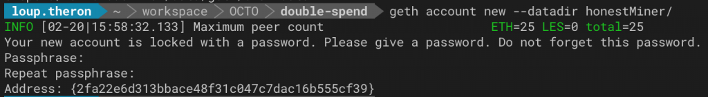 $> geth account new --datadir maliciousClient/ $> geth account new --datadir maliciousMiner/ $> geth account new --datadir honestMiner/