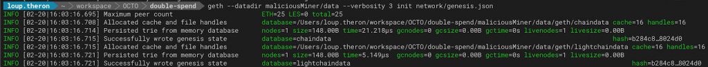$> brew tap ethereum/ethereum $> brew install ethereum $> geth --datadir honestMiner/data/ init network/genesis.json $> geth --datadir maliciousMiner/data/ init network/genesis.json
