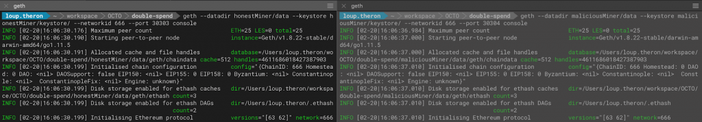 $> geth --datadir honestMiner/data --keystore honestMiner/keystore/ --networkid 666 --nodiscover --port 30303 console $> geth --datadir maliciousMiner/data --keystore maliciousMiner/keystore/ --networkid 666 --nodiscover --port 30304 console