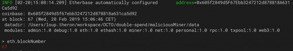 Nous décidons, par simplicité d’exécution de notre attaque, d’isoler maliciousMiner du réseau en changeant son adresse de contact. Pour rappel, maliciousMiner dispose de plus de puissance de calcul que honestMiner et donc plus de la moitié de la puissance de calcul de cette blockchain.