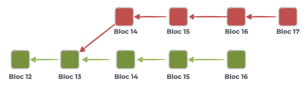 Afin que l’attaque soit réussie, la chaîne forkée malicieuse doit être plus “lourde” que l’autre chaîne, visualisable comme ceci :
